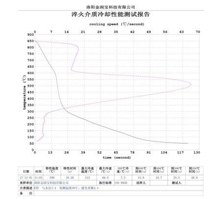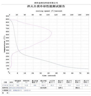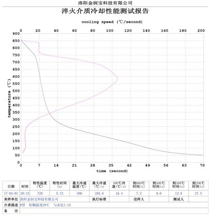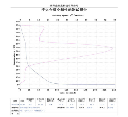 本產(chǎn)品無色或淡黃色透明液體,PH值為7。原液與水配比1:4~1:20之間。當(dāng)原液與水配比為1:4~1:9之間時,可完替代慢速淬火油、中速淬火油和高速淬火油。原液與水配比為1:4~1:5時,與慢速淬火油的冷卻性接近;原液與水配比為1:6時的水溶液的冷卻性與光亮中速淬火油的性接近;原液與水配比為1:8——1:9時的冷卻性與高速淬火油的性接近。